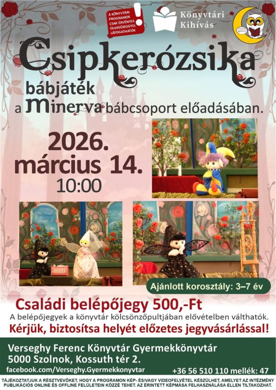 Csipkerózsika bábelőadás Szeretettel várjuk a családokat a Csipkerózsika című bábelőadásra, a Minerva bábcsoport előadásában. 2026. március 14. (szombat) 10:00 Verseghy Ferenc Könyvtár Gyermekkönyvtár — Szolnok Ajánlott korosztály: 3–7 év Családi belépő: 500 Ft A belépőjegyek elővételben válthatók meg a könyvtár kölcsönzőpultjában. Kérjük, biztosítsátok helyeteket az előzetes jegyvásárlással! Várunk benneteket egy varázslatos, mesés délelőttre!
