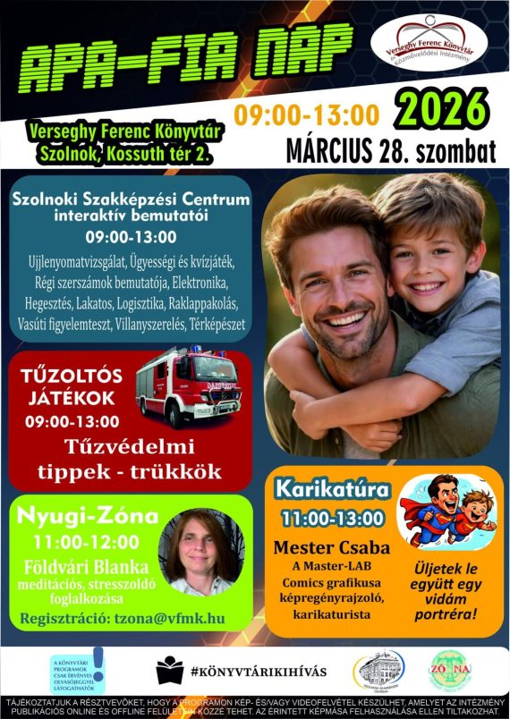 március 28. APA-FIA NAP – AZ E-KULTÚRÁT NÉPSZERŰSÍTŐ KOMPLEX PROGRAMOK 9:00-13:00 – Szolnoki Szakképzési Centrum interaktív bemutatói 9:00-13:00 – Tűzoltós játékok 11:00- Mester Csaba karikatúrarajzolás 12:00- Nyugi-zóna – stresszoldó foglalkozás Trendi program tinifiúk és szüleik számára. Időpont: 9:00-13:00 Helyszín: Verseghy Ferenc Könyvtár A rendezvény ingyenes, de érvényes könyvtári tagsághoz kötött.