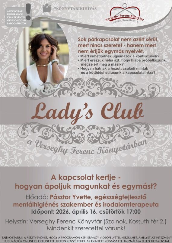 április 16. LADY’S CLUB A KAPCSOLAT KERTJE – hogyan ápoljuk magunkat és egymást? Sok párkapcsolat nem azért sérül, mert nincs szeretet, hanem mert nem értjük egymás nyelvét. Előadó: Pásztor Yvette, egészségfejlesztő mentálhigiénés szakember és irodalomterapeuta Időpont: 17:00 Helyszín: Verseghy Ferenc Könyvtár A rendezvény ingyenes, de érvényes könyvtári tagsághoz kötött. A kapcsolat kertje – hogyan ápoljuk…