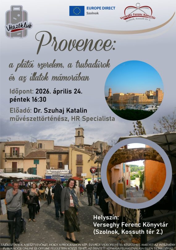 Utazóklub – Provence varázsa 🌿 Szeretnél egy estére elmerülni Dél-Franciaország hangulatában? Fedezd fel Provence különleges világát, ahol a levendulamezők illata, a középkori utcák bája és a trubadúrok romantikája találkozik! 💜 📅 Időpont: 2026. április 24. (péntek) 16:30 📍 Helyszín: Verseghy Ferenc Könyvtár (Szolnok, Kossuth tér 2.) 🎤 Előadó: Dr. Szuhaj Katalin művészettörténész Egy inspiráló előadás, ahol megismerheted Provence kultúráját, történelmét és semmihez…