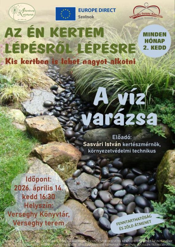 április 14. AZ ÉN KERTEM LÉPÉSRŐL LÉPÉSRE A víz varázsa Fák, bokrok, cserjék Kis kertben is lehet nagyot alkotni. Előkészületek. Előadó: Sasvári István, kertészmérnök, környezetvédelmi technikus Időpont: 16:30 Helyszín: Verseghy Ferenc Könyvtár