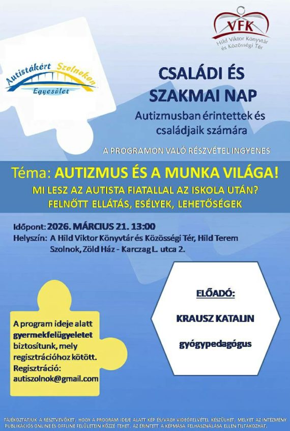 Az Autistákért Szolnokon Egyesület előadást szervez 2023. május 20-án szombaton 10 órától Az autizmus hatása a családra és a párkapcsolatokra címmel tart előadást Pappné Szabó Anita mentálhigiénés szakember