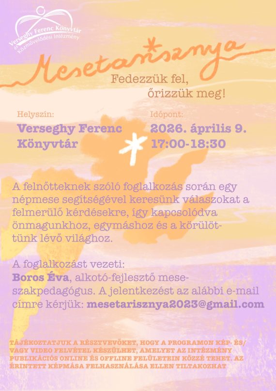 Mesetarisznya lélekfrissítő beszélgetés népmesék segítségével felnőttek számára A foglalkozást vezeti: Munkácsiné Tóth Izabella és a Boros Éva alkotó-fejlesztő mese-szakpedagógusok Helyszín: Verseghy Könyvtár Regisztráció: mesetarisznya2023@gmail.com