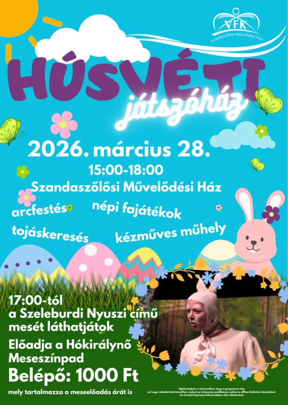 Húsvéti játszóházba várunk benneteket 2026. március 28-án, szombaton, 15:00-18:00 óra között! Lesz: – arcfestés – népi fajátékok – kézműves műhely – tojáskeresés 17 órától színpadon a Hókirálynő Meseszínpad a Szeleburdi nyuszi című mesével. Belépő: 1000 Ft, mely tartalmazza az előadás árát is.