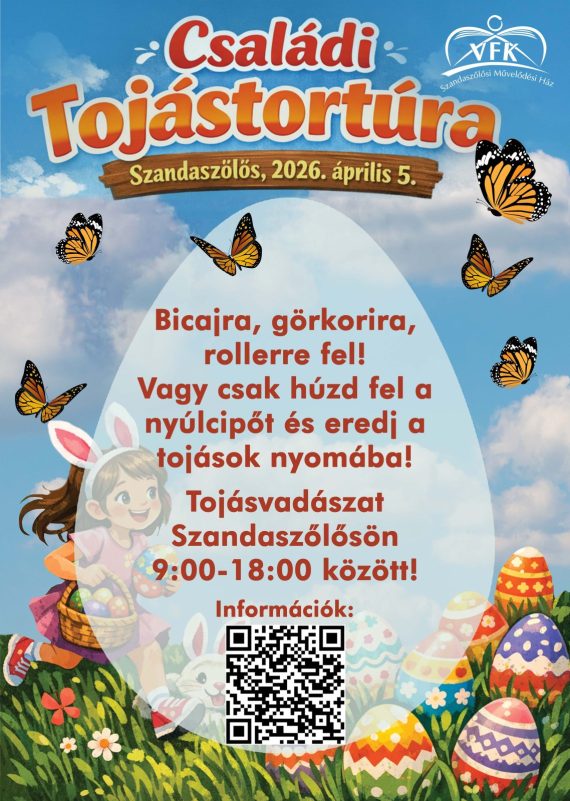 Kedves (tor)Túrázók! Szeretettel várunk benneteket a 2022-es Családi Tojás (tor)Túra megmérettetésen 2022. április 17-re! – A túra 9:00-18:00 óra között bármikor teljesíthető! – Segítségül: első állomás a Szandaszőlősi Művelődési Ház, innen kell sorjában az összes állomást bejárva eljutnotok a célig. – A többi állomáson egy villanyoszlopon keressétek a tojást, a rajtuk lévő QR kód tartalmazza…