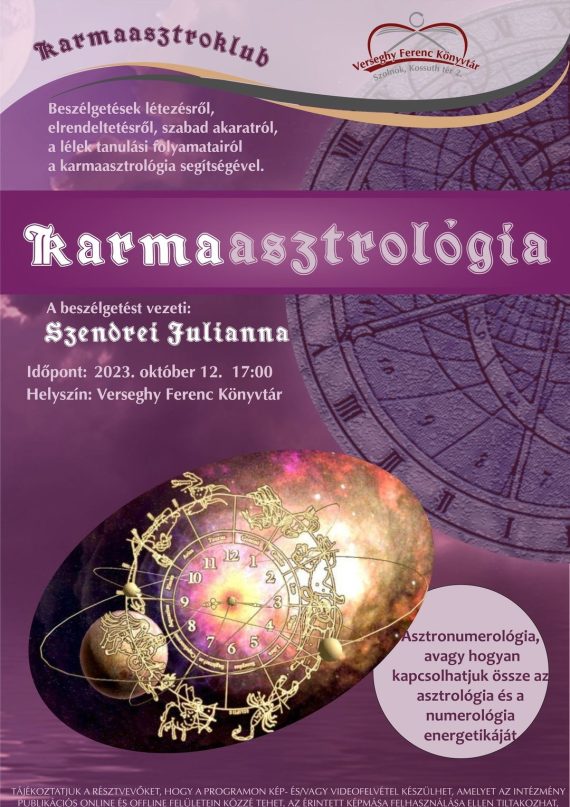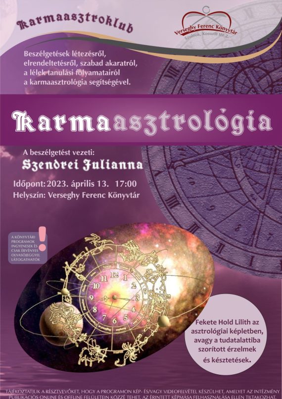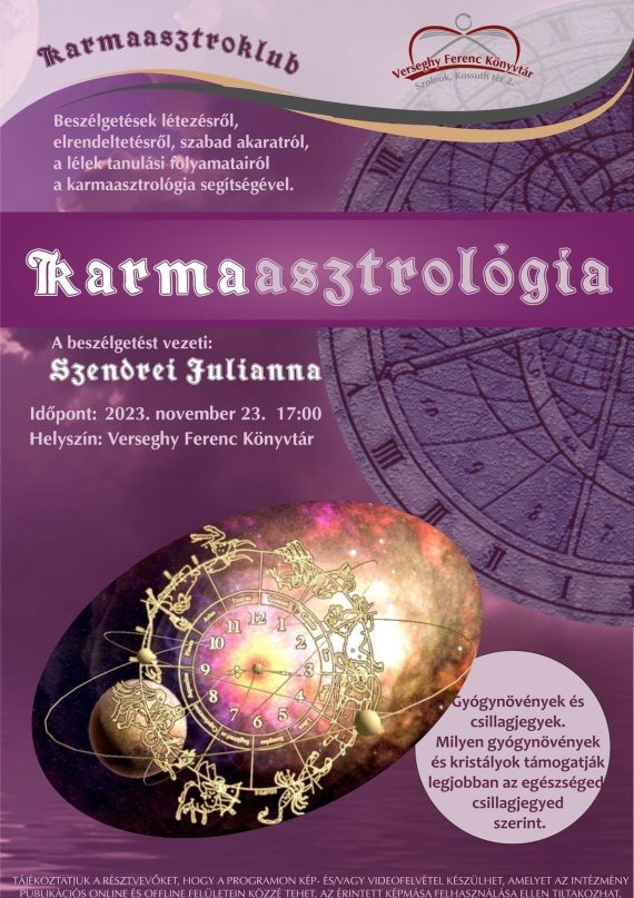 február 20. KARMAASZTROLÓGIA Hogyan szeretnek, és hogyan szeressük a csillagjegyeket! Előadó: Szendrei Julianna Időpont: 17:00 Helyszín: Verseghy Ferenc Könyvtár A rendezvény ingyenes, de könyvtári regisztrációhoz kötött.