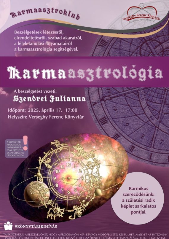 KARMAASZTROLÓGIA Karmikus szerződésünk: a születési radix képlet sarkalatos pontjai. Előadó: Szendrei Julianna Helyszín: Verseghy Ferenc Könyvtár A rendezvény ingyenes, de érvényes könyvtári tagsághoz kötött.