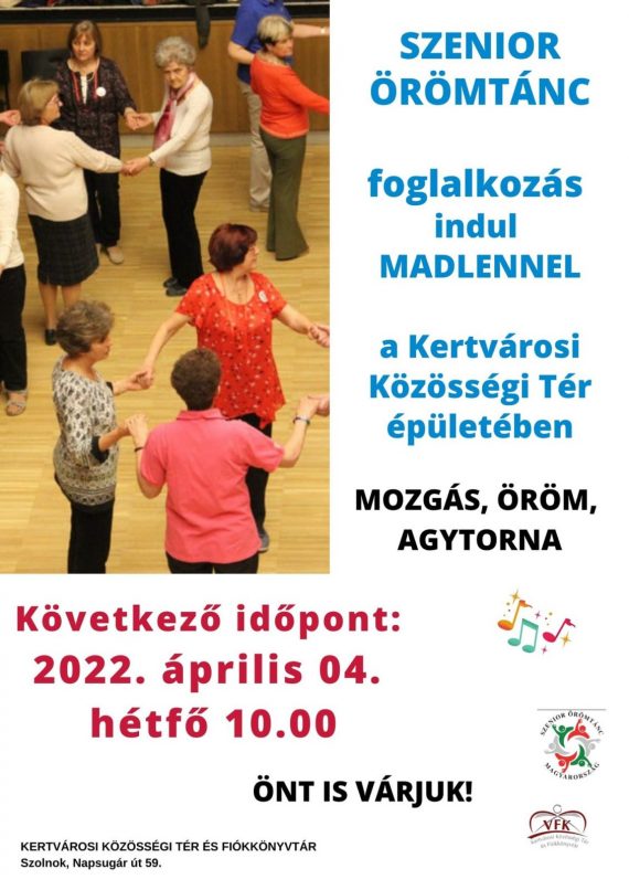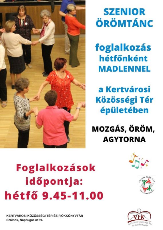 Szenior Örömtánc Madlennel 2023 őszén ismét elindult Szenior Örömtánc foglalkozásunk Madlennel a Kertvárosban, a Kertvárosi Közösségi Tér és Fiókkönyvtár épületében (Szolnok, 5000 Napsugár út 59. ) . A foglalkozás ingyenes, és minden hétfőn 9.45-től 11.00-ig várjuk a mozgásra, közösségre váró nyugdíjasokat. Mozgás-Öröm-Agytorna – ez az örömtánc foglalkozásaink szlogenje.