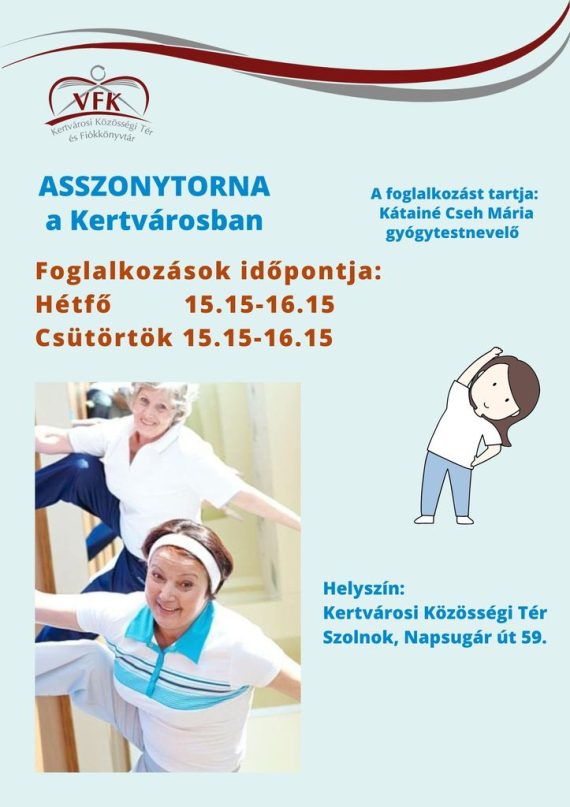 Asszonytorna Marikával 2023 őszén is elindult az Asszonytorna foglalkozás a Kertvárosi Közösségi Tér és Fiókkönyvtár épületében (Szolnok, 5000 Napsugár út 59. ) A gyógytornán alapuló egy órás foglalkozást Kátainé Cseh Mária vezeti. Várjuk az érdeklődőket szeretettel!