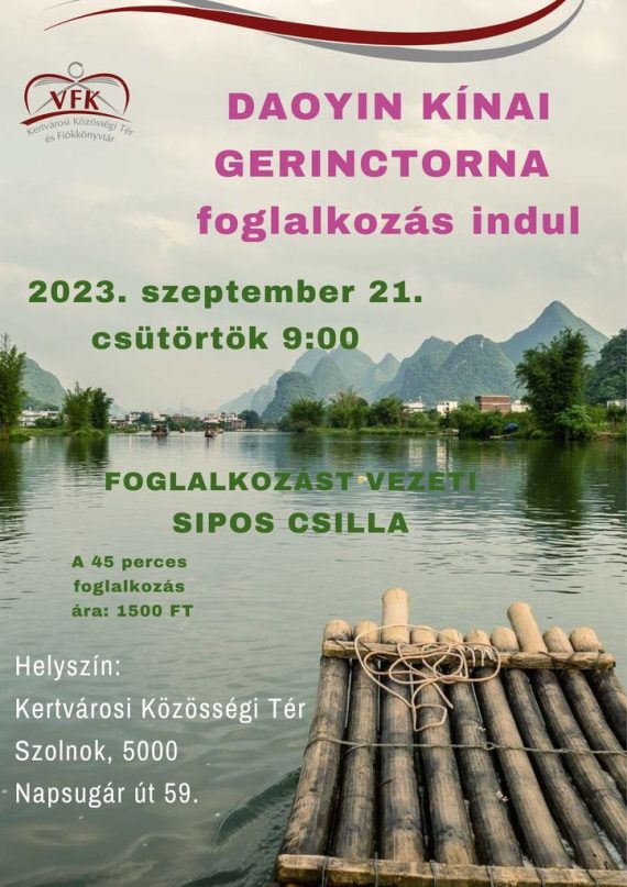 Kínai Gerinctorna Sipos Csillával Daoyin kínai gerinctornára várjuk csütörtökön 9.00-tól az érdeklődőket. Intsen búcsút a gerincproblémáknak, hát-, váll-, derékfájdalmainak a daoyin gerinctorna segítségével! Polifoam-ot szükséges hozni az órára. Helyszín: Kertvárosi Közösségi Tér és Fiókkönyvtár Szolnok, 5000 Napsugár út 59.