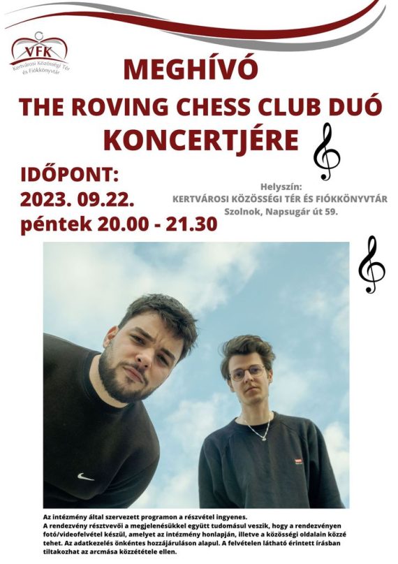 Szeptember 22-én 20.00-tól a Kertvárosi Közösségi Tér és Fiókkönyvtár épületében a The Roving Chess Club Duó koncertjével várjuk az érdeklődőket. A csapat angolszász folkzenét játszik, így aki szereti Bob Dylan dalait, vagy Simon&Garfunkel-t, az mindenképp látogasson el a koncertre.