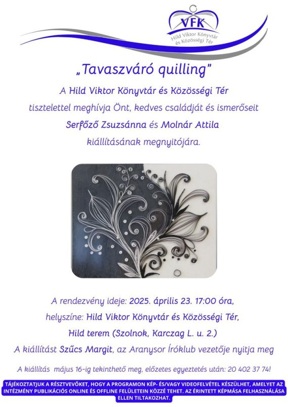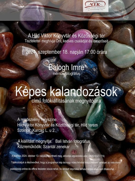 „Képes kalandozások” Balogh Imre mérnök fotográfus kiállításának megnyitója. A rendezvény időpontja: 2024. szeptember 18. 17:00 – 19.00 óra. Helyszíne. Hild Viktor Könyvtár és Közösségi Tér, Hild terem (Szolnok, Karczag L. u. 2.) A kiállítást Bali István fotográfus nyitja meg, közreműködik a Szantál zenekar. A kiállítás október 13-ig tekinthető meg, előzetes egyeztetés után. 20/402 37 74.…