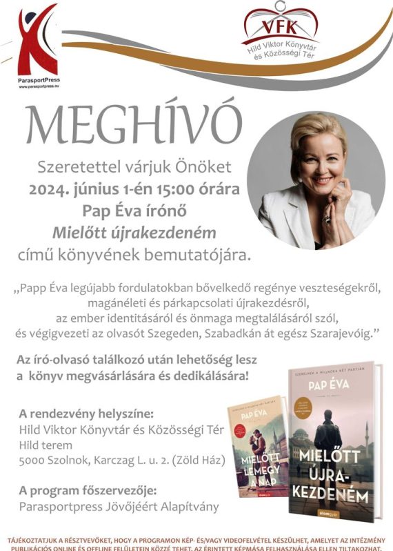 Könyvbemutató Meghívó Szeretettel várjuk Önöket 2024. június 1-én 15:00 órára Pap Éva írónő Mielőtt újrakezdeném című könyvének bemutatójára. „Papp Éva legújabb fordulatokban bővelkedő regénye veszteségekről, magánéleti és párkapcsolati újrakezdésről, az ember identitásáról és önmaga megtalálásáról szól, és végigvezeti az olvasót Szegeden, Szabadkán át egész Szarajevóig.” Az író-olvasó találkozó után lehetőség lesz a könyv megvásárlására és…