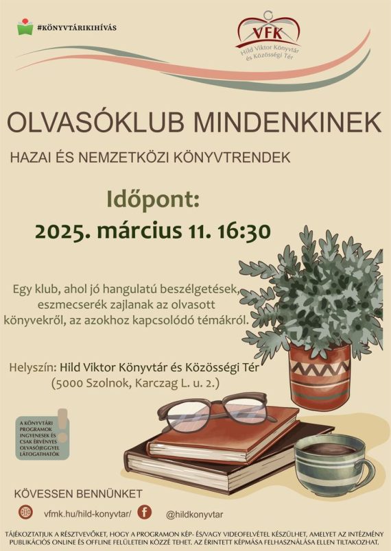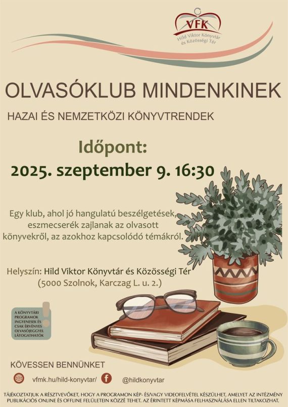 Az olvasóklubban hazai és nemzetközi könyvtrendek alapján összeállított, több mint húsz könyvből álló listából választhatnak a tagok. Az így elolvasott műveket a következő alkalommal megbeszélik a megjelentek. Szeretettel várunk minden érdeklődőt! Időpont: 2023. október 3. (kedd) 16:00 Helyszín: Hild Viktor Könyvtár és Közösségi Tér Szolnok, Karczag L. u. 2. TÁJÉKOZTATJUK A RÉSZTVEVŐKET, HOGY A PROGRAMON…
