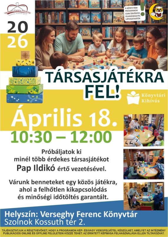 április 18. JÁTÉKOS DÉLELŐTT Társasjátékozás Pap Ildikóval Próbáljatok ki minél több érdekes társasjátékot Pap Ildikó gyógypedagógus értő vezetésével. Várunk Benneteket egy közös játékra. Időpont: 10:30-12:00 Helyszín: Verseghy Ferenc Könyvtár A rendezvény ingyenes, de érvényes könyvtári tagsághoz kötött.