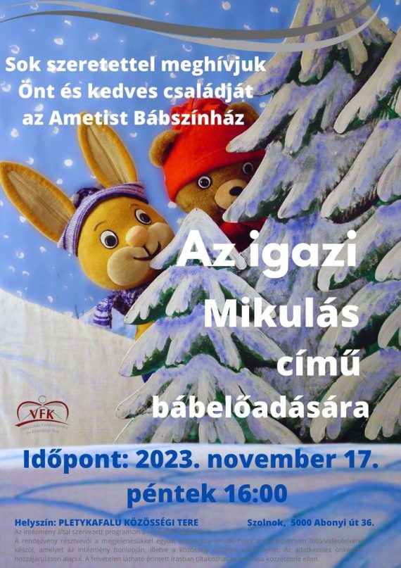 Bábelőadás – Az igazi Mikulás 2023. november 17-én pénteken 16:00-tól az Ametist Bábszínház bábelőadásával várjuk a gyerekeket a Pletykafalu Közösségi Tere épületében. A mesében az erdő kis lakói izgatottan várják a Mikulást. Igaz, hogy csak az embergyerekeknek hoz ajándékot? Vagy a kíváncsi állatkák is kapnak valamit? Sok-sok játék, kaland, móka, s végül hoppon marad a…