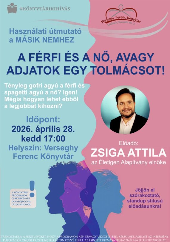 Használati útmutató a MÁSIK NEMHEZ Mit jelent a férfi „képes” szemüvege, hogy értelmezhető a nő „puzzle” gondolkodása. Tényleg gofri agyú a férfi és spagetti agyú a nő? Igen! 😃 Mégis hogyan lehet ebből a legjobbat kihozni a hétköznapokban, a párkapcsolatokban és a munkában? Jöjjön el szórakoztató, standup stílusú előadásunkra! Előadó: Zsiga Attila Időpont: 2026. április…